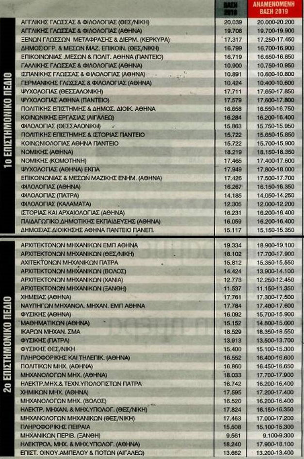 Στο 1ο επιστημονικό πεδίο οι βάσεις θα εμφανίσουν ελαφρές αυξομειώσεις και θα κυμανθούν στα επίπεδα του 2018 αλλά στην πλειονότητα θα υπερτερεί το θετικό πρόσημο και όχι το αρνητικό.