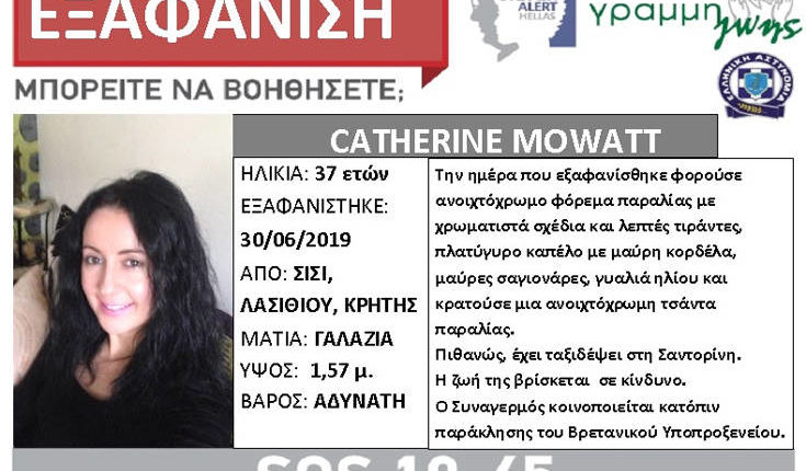 Συναγερμός silver alert, έχει εκδοθεί για την ανεύρεση της 37χρονης Catherine Mowatt στη Κρήτη.