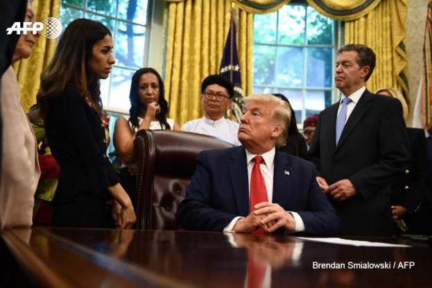 Η Μουράντ, μια από τις χιλιάδες γυναίκες και μικρά κορίτσια της μειονότητας των Γεζίντι που απήχθησαν και μετατράπηκαν σε σκλάβες του Ισλαμικού Κράτους (ΙΚ), την περίοδο που η τζιχαντιστική οργάνωση καταλάμβανε αχανείς εκτάσεις του Ιράκ το 2014, πήγε στο Οβάλ Γραφείο μαζί με μια μικρή ομάδα ανθρώπων που επέζησε αυτού του ανελέητου θρησκευτικού διωγμού προκειμένου να συναντηθεί με τον Τραμπ στο περιθώριο εκδήλωσης για τις θρησκευτικές ελευθερίες που οργάνωσε το Στέιτ Ντιπάρτμεντ.