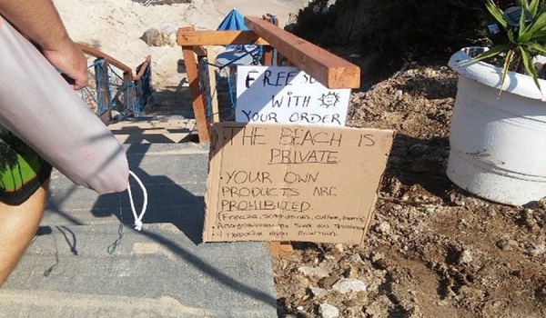 “Αφου βρηκαμε 1 τετραγωνικο να βαλουμε την ομπρελα μας, μετακινησαμε λιγο τις πλαστικες καρεκλες και την δικη μας ομπρελα, ωστε να μπορεσει να κατσει και μια οικογενεια απο το Βελιγραδι με τα 3 της παιδια, εφ’οσον δεν υπηρχε χωρος. Λιγα δευτερολεπτα μετα, ο «ιδιοκτητης» της παραλιας, ηρθε βαζοντας τις καρεκλες παλι στο σημειο, λεγοντας «no this is not allowed this is a private beach»”.