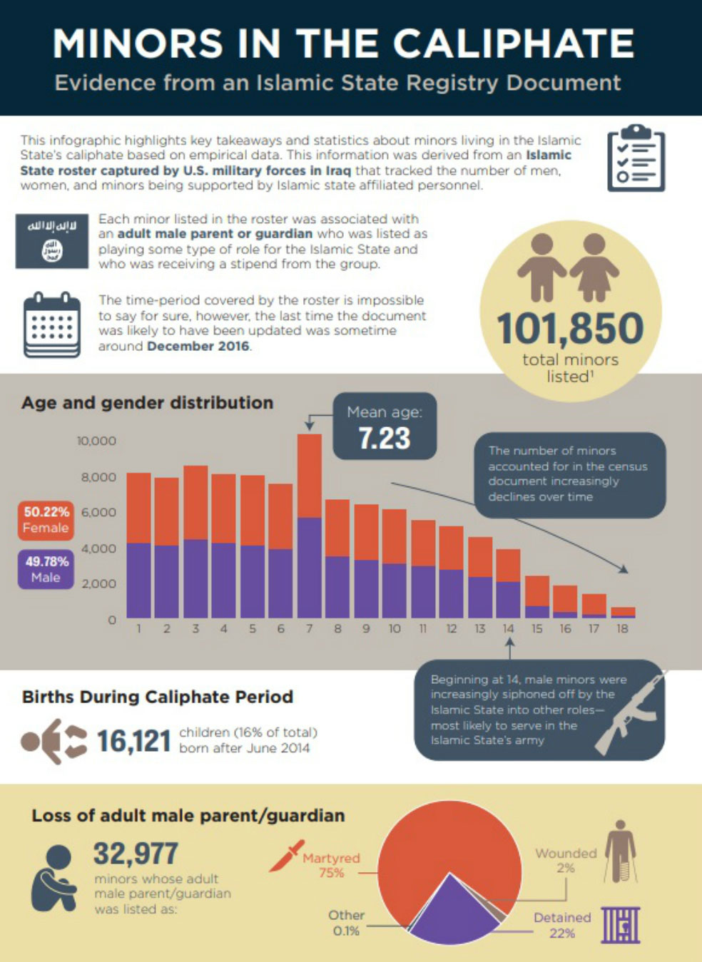 Επί του συνόλου του καταλόγου αυτού, 16.121 ανήλικοι (δηλαδή 16% του συνόλου) γεννήθηκαν μετά τον Ιούνιο του 2014, ημερομηνία της ανακοίνωσης της ίδρυσης του αυτοαποκαλούμενου χαλιφάτου. Τίθεται συνεπώς θέμα εθνικότητάς τους, καθώς τα πιστοποιητικά γέννησής τους δεν αναγνωρίζονται από κανέναν.