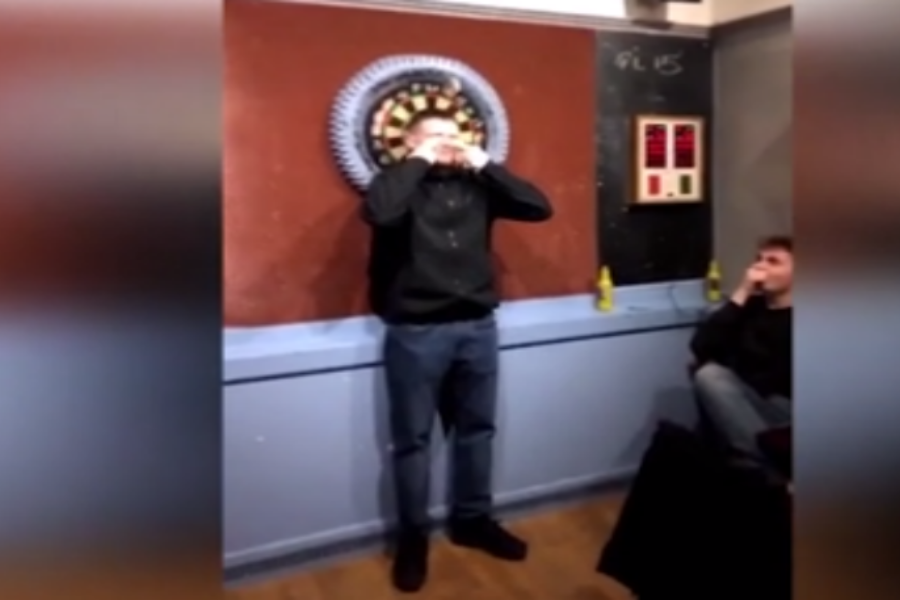 Το στοίχημα ήταν 11,5 ευρώ (10 λίρες) και ήταν άκρως επικίνδυνο, αφού τα βελάκια του τα έριξαν στο πρόσωπο.