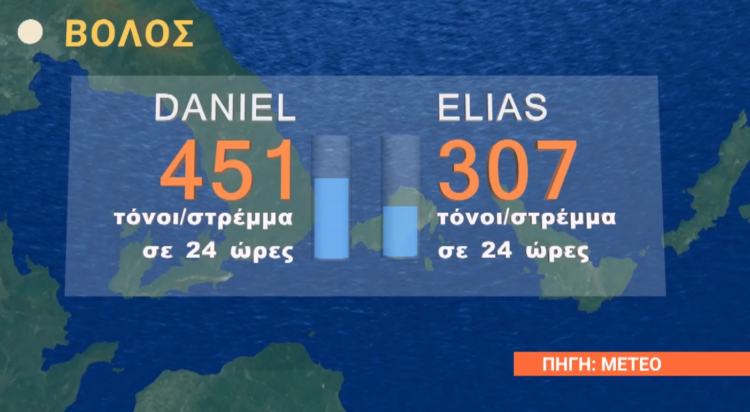 Όπως μεταδίδει η ΕΡΤ, στην κακοκαιρία Daniel καταγράφηκαν 451 τόνοι νερού ανά στρέμμα μέσα σε ένα 24ωρο, ενώ αντίστοιχα κατά την διάρκεια της κακοκαιρίας Elias, καταγράφηκαν 307 τόνοι ανά στρέμμα μέσα σε μία ημέρα.