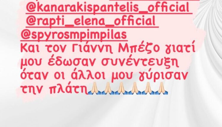 Πιο συγκεκριμένα, η Σάσα Σταμάτη έγραψε: «Θέλω να ευχαριστήσω δημόσια τους: Μιμή Ντενίση, Παντελή Καναράκη, Έλενα Ράπτη, Σπύρο Μπιμπίλα και τον Γιάννη Μπέζο, γιατί μου έδωσαν συνέντευξη όταν οι άλλοι μου γύρισαν την πλάτη»