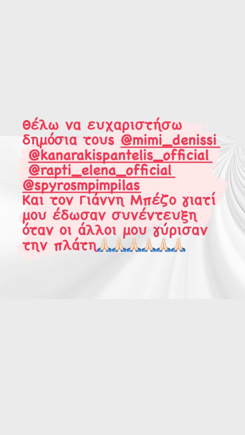 Πιο συγκεκριμένα, η Σάσα Σταμάτη έγραψε: «Θέλω να ευχαριστήσω δημόσια τους: Μιμή Ντενίση, Παντελή Καναράκη, Έλενα Ράπτη, Σπύρο Μπιμπίλα και τον Γιάννη Μπέζο, γιατί μου έδωσαν συνέντευξη όταν οι άλλοι μου γύρισαν την πλάτη»