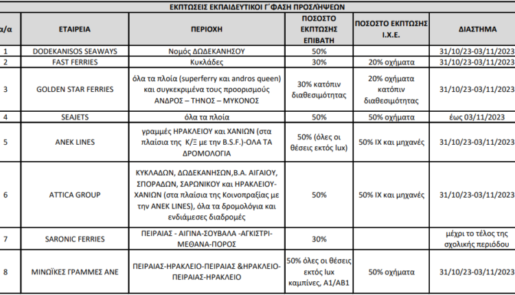 Με κοινή πρωτοβουλία των Υπουργείων Παιδείας, Θρησκευμάτων και Αθλητισμού και Ναυτιλίας και Νησιωτικής Πολιτικής, ανακοινώνονται εκπτώσεις έως και 50% στα ακτοπλοϊκά εισιτήρια των αναπληρωτών εκπαιδευτικών.