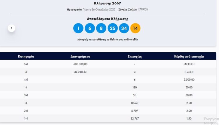 Στην κλήρωση ΤΖΟΚΕΡ, την Πέμπτη 26/10/2023 (αριθμός κλήρωσης 2667), οι τυχεροί αριθμοί ήταν οι εξής: