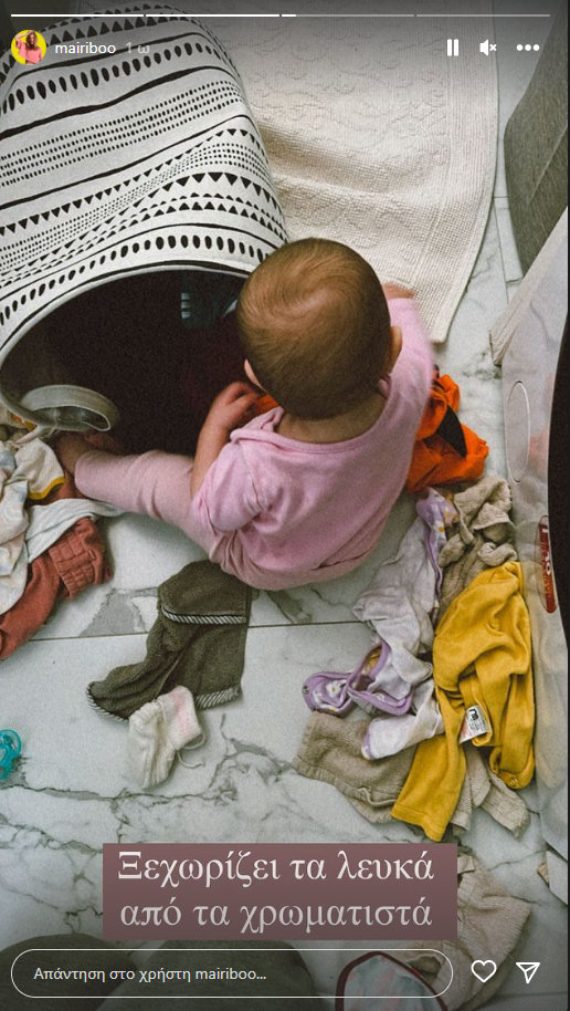 Στα νέα stories που ανέβασε η Μαίρη Συνατσάκη στο Instagram είδαμε τη νέα φωτογραφία με την μικρή Ολίβια, να ασχολείται με τα ρούχα στο μπάνιο του σπιτιού. «Ξεχωρίσει τα λευκά απ΄τα χρωματιστά» έγραψε η Μαίρη Συνατσάκη.
