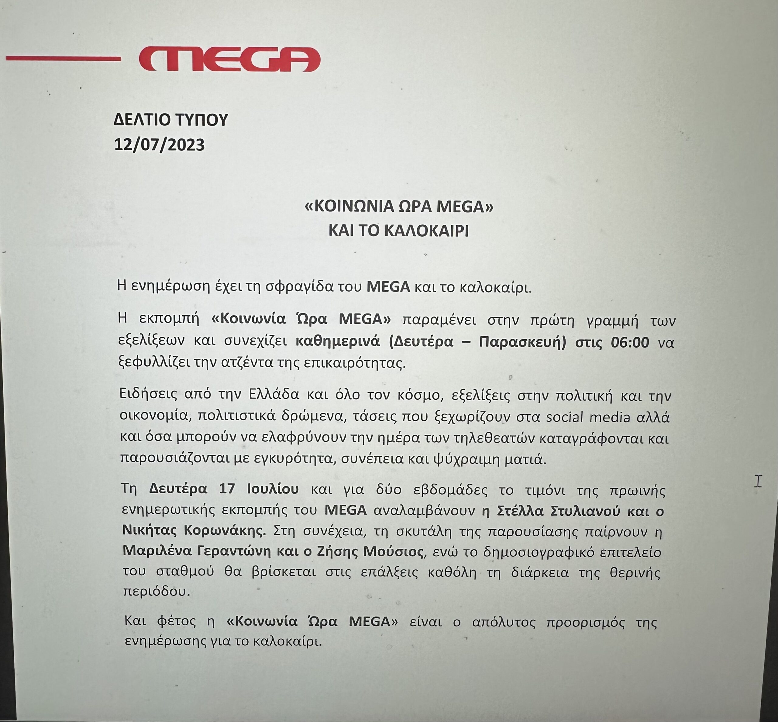 Οταν η Διοίκηση ενημερώθηκε για την παραίτησή της δεν την έκανε αποδεκτή και της πρότεινε κάποιες εναλλακτικές τόσο εντός MEGA όσο και εκτός, προτείνοντάς της μεταξύ άλλων και μεταπήδηση στο One. Ωστόσο, τίποτα από όσα της δόθηκαν δεν πληρούσε πλέον τα θέλω της και πριν από λίγες μέρες αποφάσισε να αποχωρήσει τελικά από το κανάλι αν και ακόμα και σήμερα οι σχέσεις της με τον Πρόεδρο, Βαγγέλη Μαρινάκη είναι πολύ καλές.