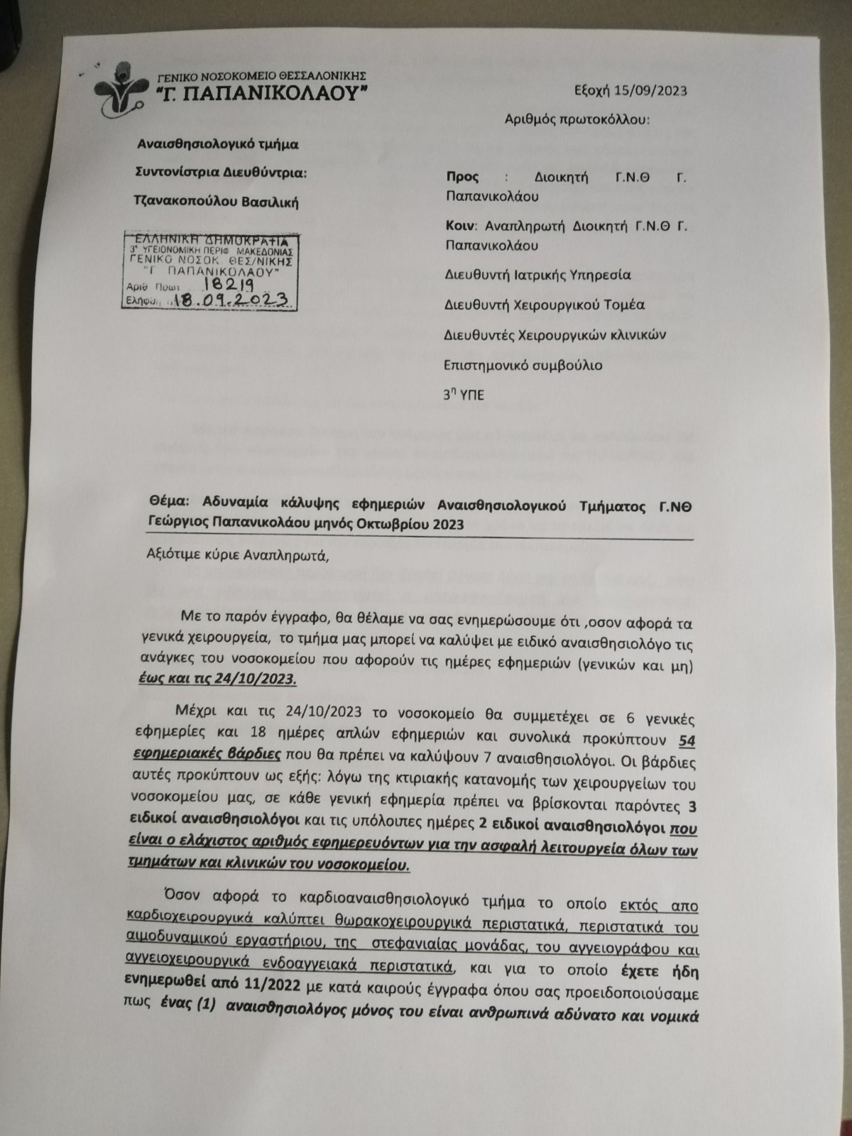 Επιπρόσθετα, αναφερόμενος στα νοσοκομεία της Θεσσαλονίκης ο πρόεδρος της ΠΟΕΔΗΝ επισημαίνει τα εξής: «Στα νοσοκομεία της Θεσσαλονίκης στις 70 ανεπτυγμένες χειρουργικές αίθουσες λειτουργούν οι 43. Το Παπανικολάου δεν είναι το μόνο νοσοκομείο που ανέστειλε τα τακτικά χειρουργεία. Το ίδιο έπραξε και το νοσοκομείο ΕΔΕΣΣΑΣ για το μήνα ΟΚΤΩΜΒΡΗ καθότι έμειναν μόνο 2 αναισθησιολόγοι από 4».