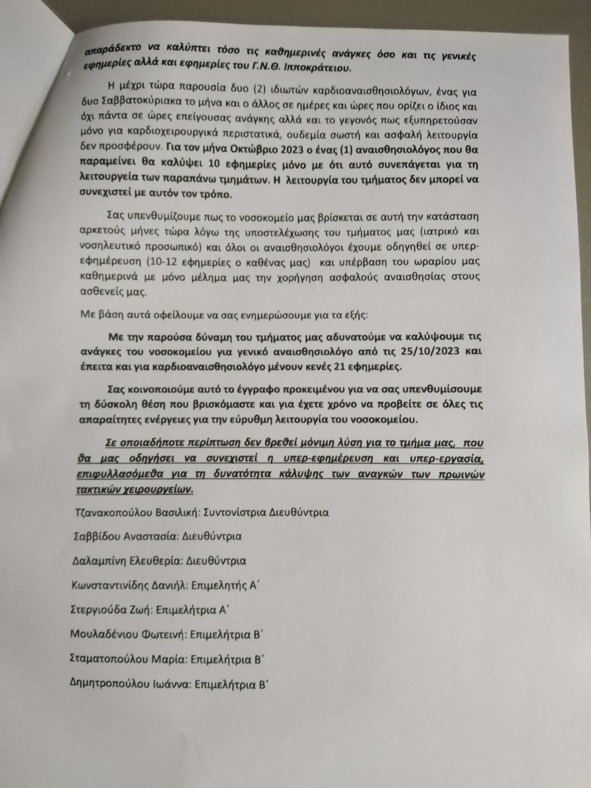 «Το 40% των χειρουργικών αιθουσών είναι κλειστές στα νοσοκομεία της χώρας λόγω έλλειψης νοσηλευτικού προσωπικού και αναισθησιολόγων. Νοσοκομεία με επικαιροποιημένες λίστες έχουν ασθενείς στο περίμενε τρία χρόνια. Άλλα νοσοκομεία δεν μπήκαν στο κόπο να επικαιροποιήσουν τις λίστες και εμφανίζονται ασθενείς από το 2015 που κανείς δεν ξέρει τι απέγιναν», αναφέρει συγκεκριμένα.