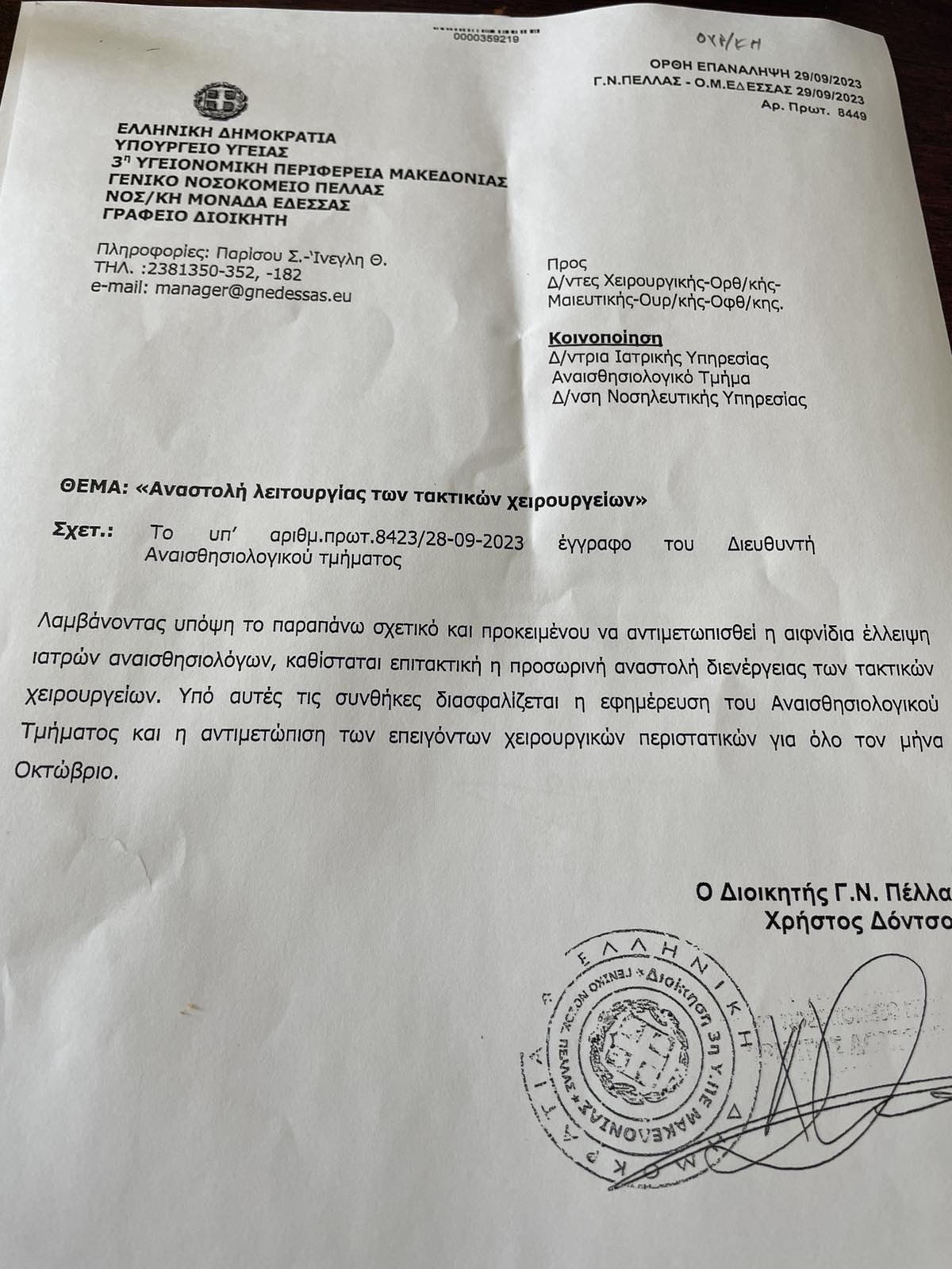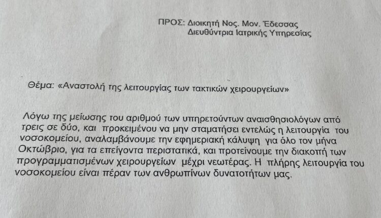 Στον αέρα βρίσκονται από σήμερα τα τακτικά χειρουργεία στο νοσοκομείο Παπανικολάου λόγω έλλειψης αναισθησιολόγων το ιατρικό προσωπικό με επιστολή του προς την διοίκηση του νοσοκομείου ενημέρωσε από χθες πως είναι αδύνατον να καλυφθούν οι εφημερίες του Οκτωβρίου από τις 25 του μήνα και έτσι από σήμερα αναστέλλονται τα τακτικά πρωινά χειρουργεία. Με αφορμή τα παραπάνω ο πρόεδρος της ΠΟΕΔΗΝ Μιχάλης Γιαννάκος, χαρακτήρισε «αναμενόμενη» τη διακοπή των τακτικών χειρουργείων στο νοσοκομείο, καθώς σύμφωνα με τα όσα καταγγέλλει «έμειναν 7 αναισθησιολόγοι από το 2020 την ώρα που το νοσοκομείο έχει 27 συνολικά οργανικές θέσεις»