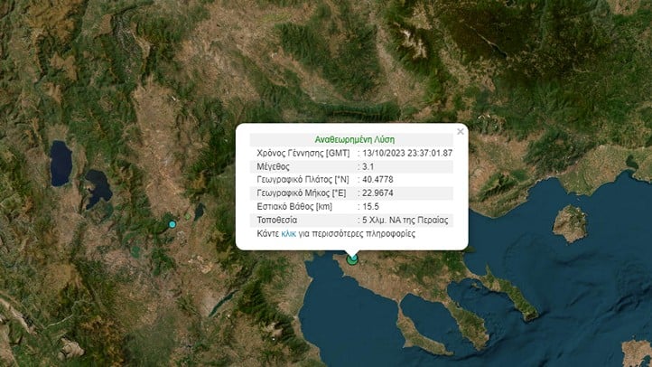 Σύμφωνα με το Γεωδυναμικό Ινστιτούτο το επίκεντρο της δόνησης εντοπίζεται στα 5 χλμ. Νοτιοανατολικά της Περαίας, ενώ το εστιακό βάθος υπολογίζεται στα 15,5 χλμ.