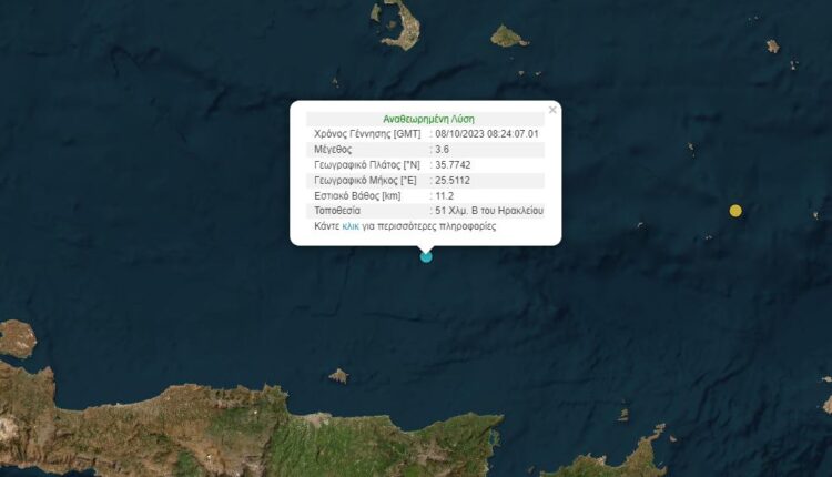 Σεισμός μεγέθους 3,6 βαθμών της κλίμακας Ρίχτερ σημειώθηκε το πρωί της Κυριακής 8/10 ανοιχτά της Κρήτης. Σύμφωνα με το Γεωδυναμικό, ο σεισμός που έγινε στις 11.24 πμ είχε επίκεντρο θαλάσσια περιοχή 51 χιλιόμετρα βόρεια του Ηρακλείου.