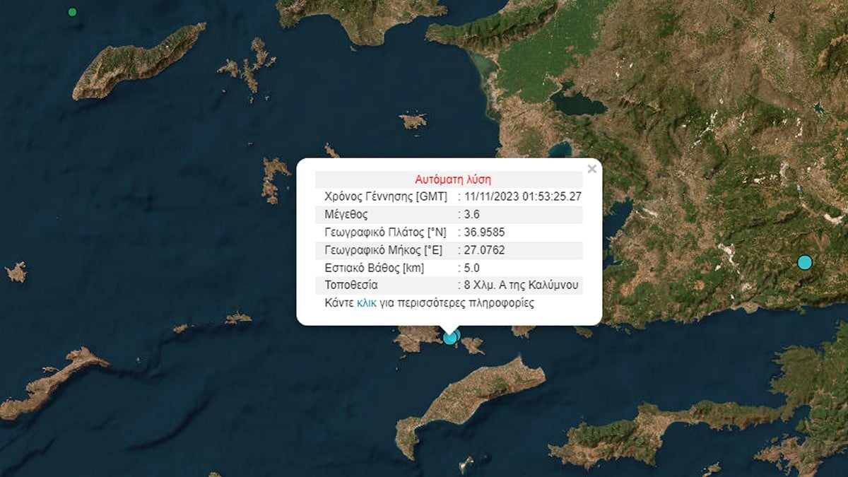 Δυο σεισμικές δονήσεις μεγέθους 3,8 και 3,6 βαθμών της κλίμακας Ρίχτερ σημειώθηκε τα ξημερώματα του Σαββάτου ανοιχτά της Καλύμνου.