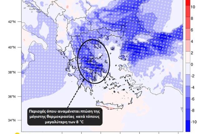 Στον χάρτη που ακολουθεί παρουσιάζεται η αναμενόμενη πτώση της μέγιστης θερμοκρασίας σήμερα, Πέμπτη 9 Νοεμβρίου σε σχέση με αυτή της Τετάρτης 08/11. Όπως φαίνεται, σε τμήματα της Κεντρικής Μακεδονίας, της Θεσσαλίας, της Ανατολικής Στερεάς και της Ανατολικής Πελοποννήσου η πτώση αναμένεται να ξεπεράσει τους 8 °C.