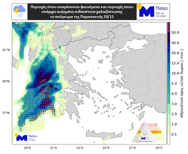 - Στις περισσότερες περιοχές της χώρας νεφώσεις παροδικά αυξημένες με τοπικές βροχές και σποραδικές καταιγίδες, οι οποίες θα είναι τοπικά ισχυρές από τις πρωινές ώρες στο βόρειο Ιόνιο, την Ήπειρο, τη δυτική Μακεδονία, τη δυτική Στερεά, τα νότια τμήματα της Ανατολικής Πελοποννήσου και τα Κύθηρα, από τις μεσημβρινές ώρες στην κεντρική Μακεδονία, την ανατολική Μακεδονία και πιθανώς τη Θράκη, ενώ προς τις βραδινές ώρες τα φαινόμενα θα εξασθενήσουν στις περισσότερες περιοχές και θα περιοριστούν στα νησιά του ανατολικού Αιγαίου και τα τα Δωδεκάνησα.