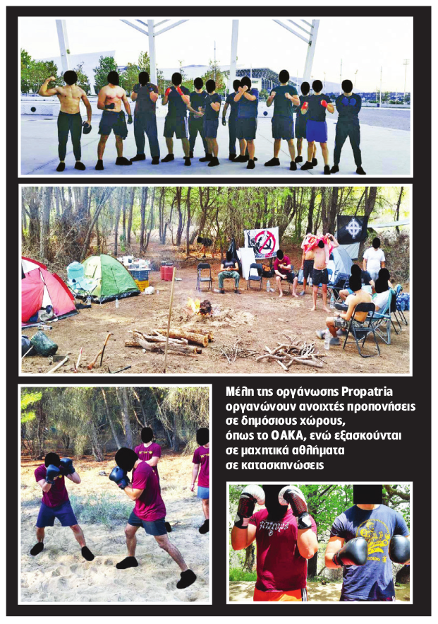 Δεν είναι η πρώτη φορά ωστόσο που η Propatria διοργανώνει τέτοιου είδους «μαχητικές συνάξεις», όπως ακριβώς έκανε η Χρυσή Αυγή. Στον περιβάλλοντα χώρο του ΟΑΚΑ, αλλά και σε άλλους χώρους, τα μέλη της Propatria διοργανώνουν «ανοιχτές προπονήσεις». «Οι αθλητές μας δείχνουν τις ικανότητές τους στην πυγμαχία, στο ΜΜΑ και στο kick boxing», γράφει το σχόλιο κάτω από τη φωτογραφία των γυμνασμένων, κοντοκουρεμένων νέων που κρύβουν τα πρόσωπά τους.