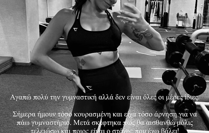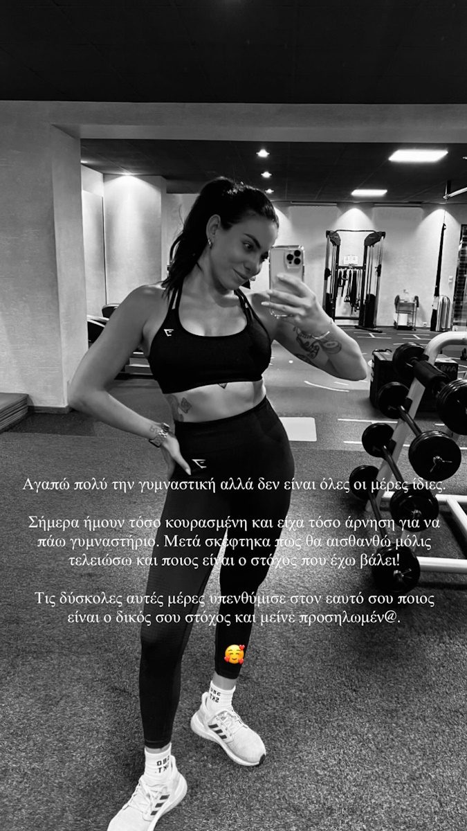 «Αγαπώ πολύ την γυμναστική αλλά δεν είναι όλες οι μέρες ίδιες. Σήμερα ήμουν τόσο κουρασμένη και είχα τόσο άρνηση για να πάω γυμναστήριο. Μετά σκέφτηκα πώς θα αισθανθώ μόλις τελειώσω και ποιος είναι ο στόχος που έχω βάλει. Τις δύσκολες αυτές μέρες υπενθύμισε στον εαυτό σου ποιος είναι ο δικός σου στόχος και μείνε προσηλωμένος/η», έγραψε κάτω από την ανάρτησή της η Ευρυδίκη Βαλαβάνη.
