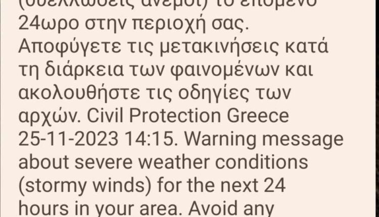 Μεταξύ άλλων αναφέρει: «Αποφύγετε τις μετακινήσεις κατά τη διάρκεια των φαινομένων και ακολουθήστε τις οδηγίες των Αρχών».