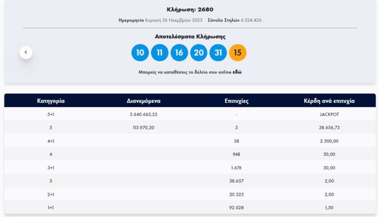 Στην κλήρωση ΤΖΟΚΕΡ, την Κυριακή 26/11/2023 (αριθμός κλήρωσης 2680), οι τυχεροί αριθμοί ήταν οι εξής: