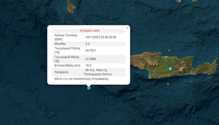 Σεισμός μεγέθους 3,2 βαθμούς της κλίμακας Ρίχτερ σημειώθηκε τις πρώτες πρωινές ώρες της Τρίτης 14 Νοεμβρίου ανοιχτά της Κρήτης.