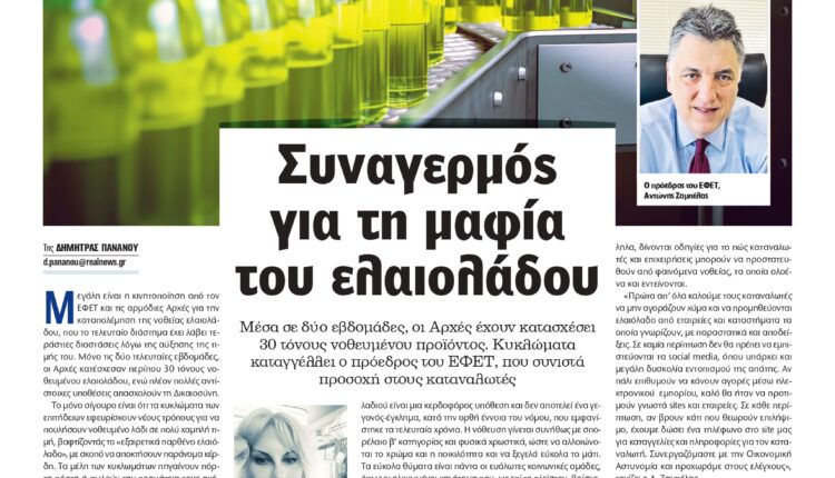 Τα πρόσφατα περιστατικά, όπως είναι λογικό, έχουν σημάνει συναγερμό στον ΕΦΕΤ. «Τις τελευταίες ημέρες έχουμε αρχίσει να εντατικοποιούμε τους ελέγχους. Είμαστε σε θέση να γνωρίζουμε ότι πρόκειται για κυκλώματα και έχουμε ήδη στείλει έγγραφα στην Οικονομική Αστυνομία και στους αρμόδιους φορείς. Μόνο τις τελευταίες δύο εβδομάδες έχουμε κατασχέσει περίπου 30 τόνους νοθευμένου ελαιολάδου», δηλώνει στην «R» ο πρόεδρος του ΕΦΕΤ, Αντώνης Ζαμπέλας.