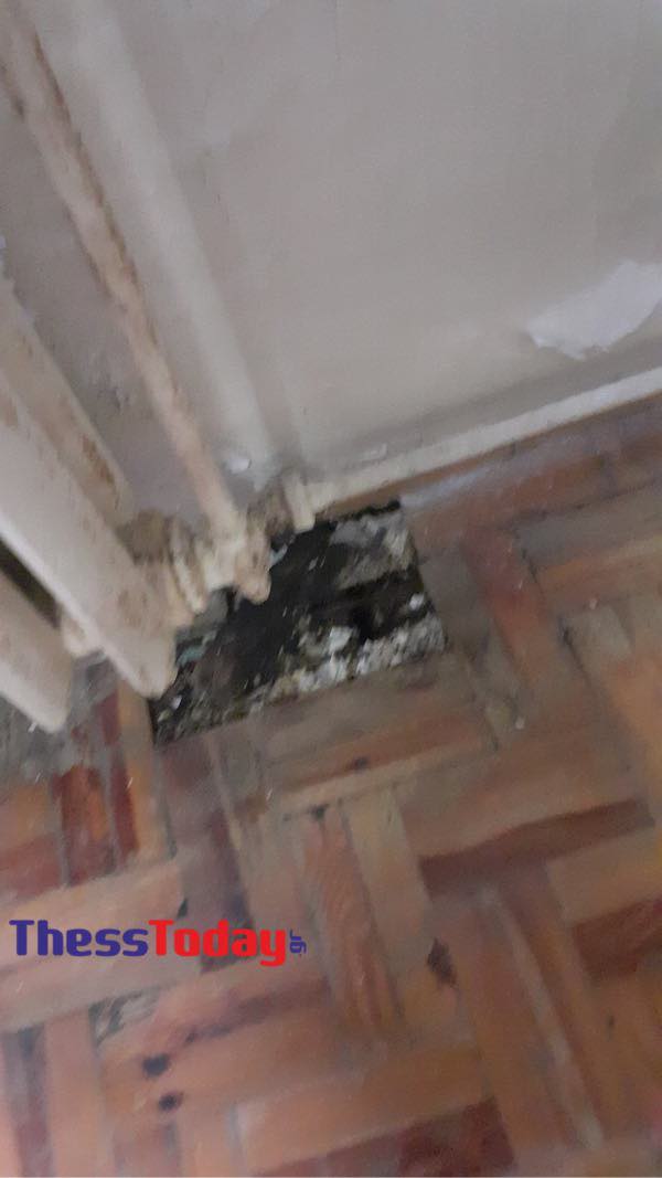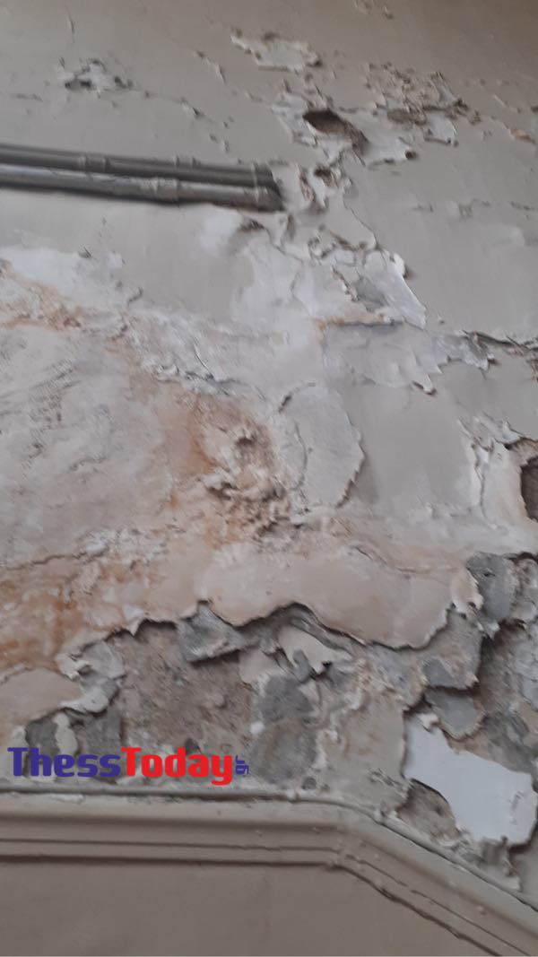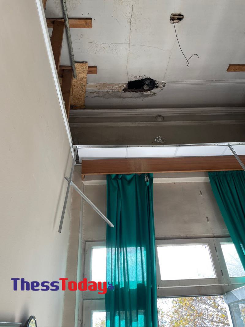 Όπως φαίνεται στις φωτογραφίες του Thesstoday.gr, οι πλάκες της οροφής αποκολλήθηκαν εντελώς από το ταβάνι και προσγειώθηκαν στο σαλόνι όπου αναπαύονται οι γιατροί, με αποτέλεσμα τον τραυματισμό του χειρουργού που βρισκόταν από κάτω. Στους τοίχους υπάρχει μούχλα και εκτεταμένες φθορές, ενώ τμήμα από το πάτωμα έχει ξεκολλήσει.