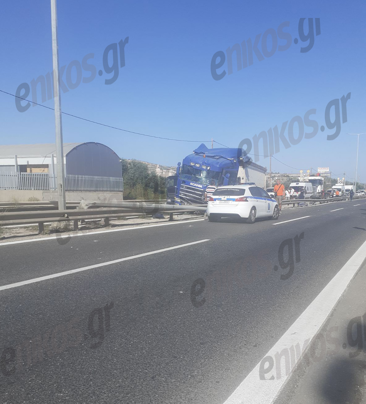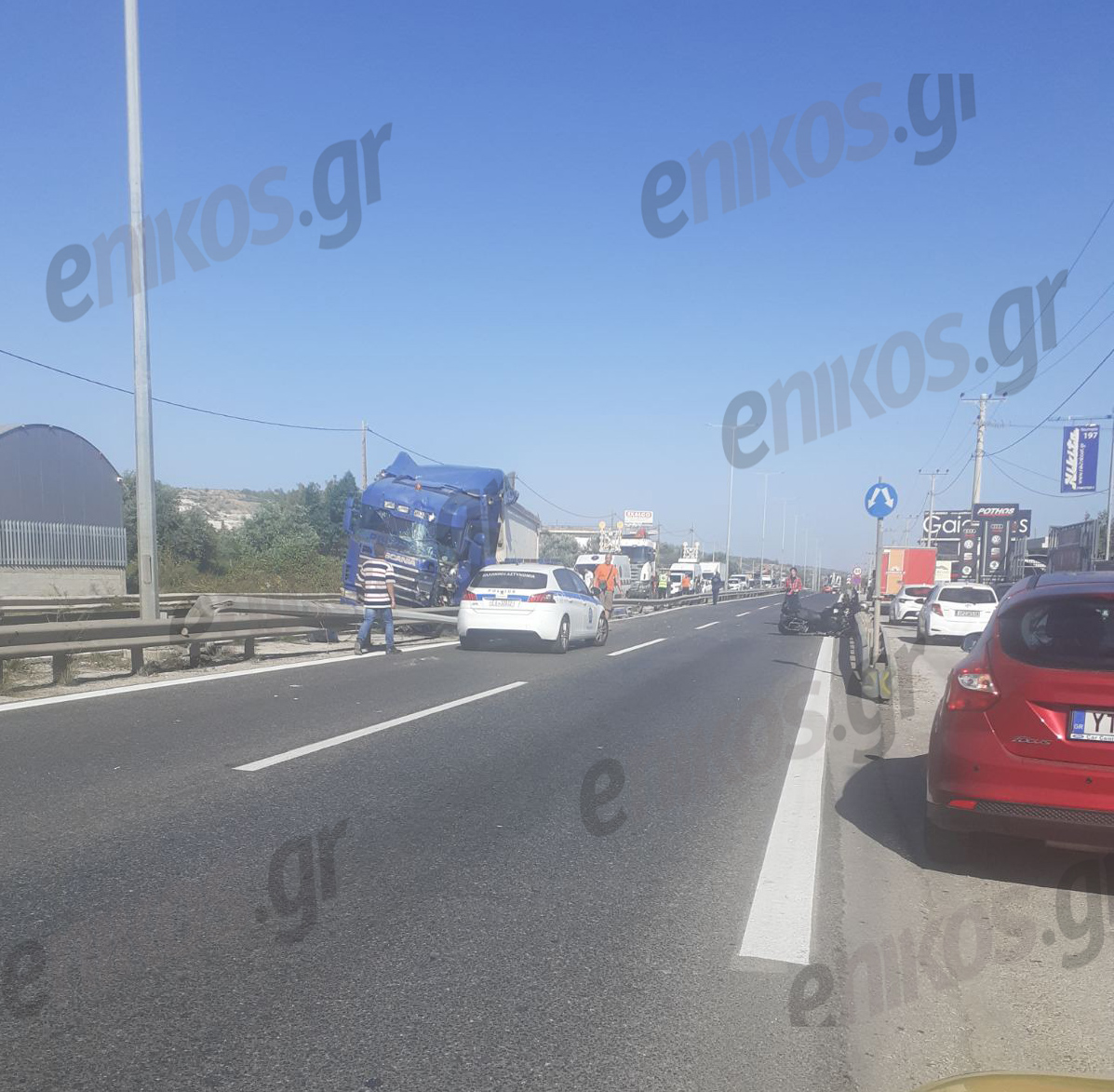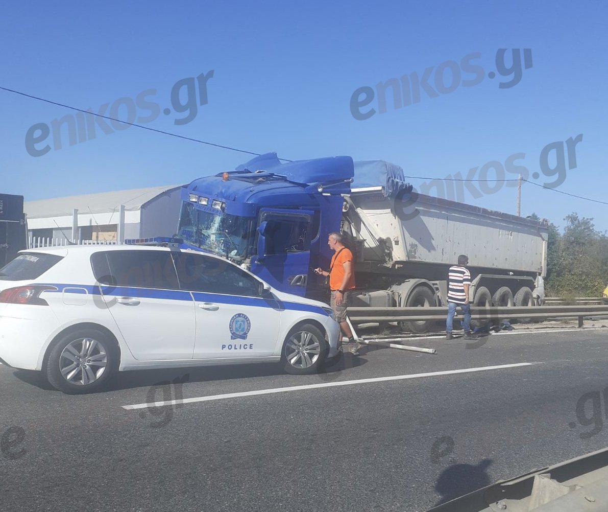 Το τροχαίο συνέβη στο ρεύμα από Κορωπί προς την Βάρη, λίγο πριν από τα τούνελ. Το διαχωριστικό έχει υποστεί ζημιές, ενώ το παρμπρίζ της νταλίκας έχει σπάσει και η μηχανή βρίσκεται πεσμένη στο έδαφος, στο αντίθετο ρεύμα κυκλοφορίας.