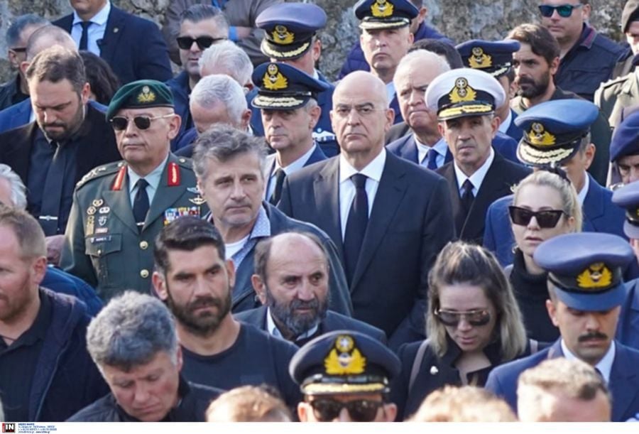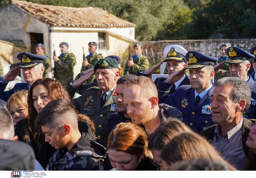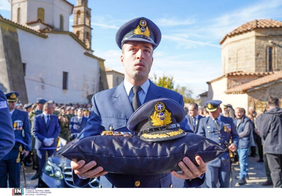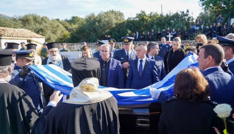 Το φέρετρο του 40χρονου είναι σκεπασμένο με την ελληνική σημαία. Τραγικές φιγούρες η σύζυγος και τα παιδιά του, που έμελλε να δουν και να καταγράψουν σε βίντεο τη συντριβή του εκπαιδευτικού αεροσκάφους.