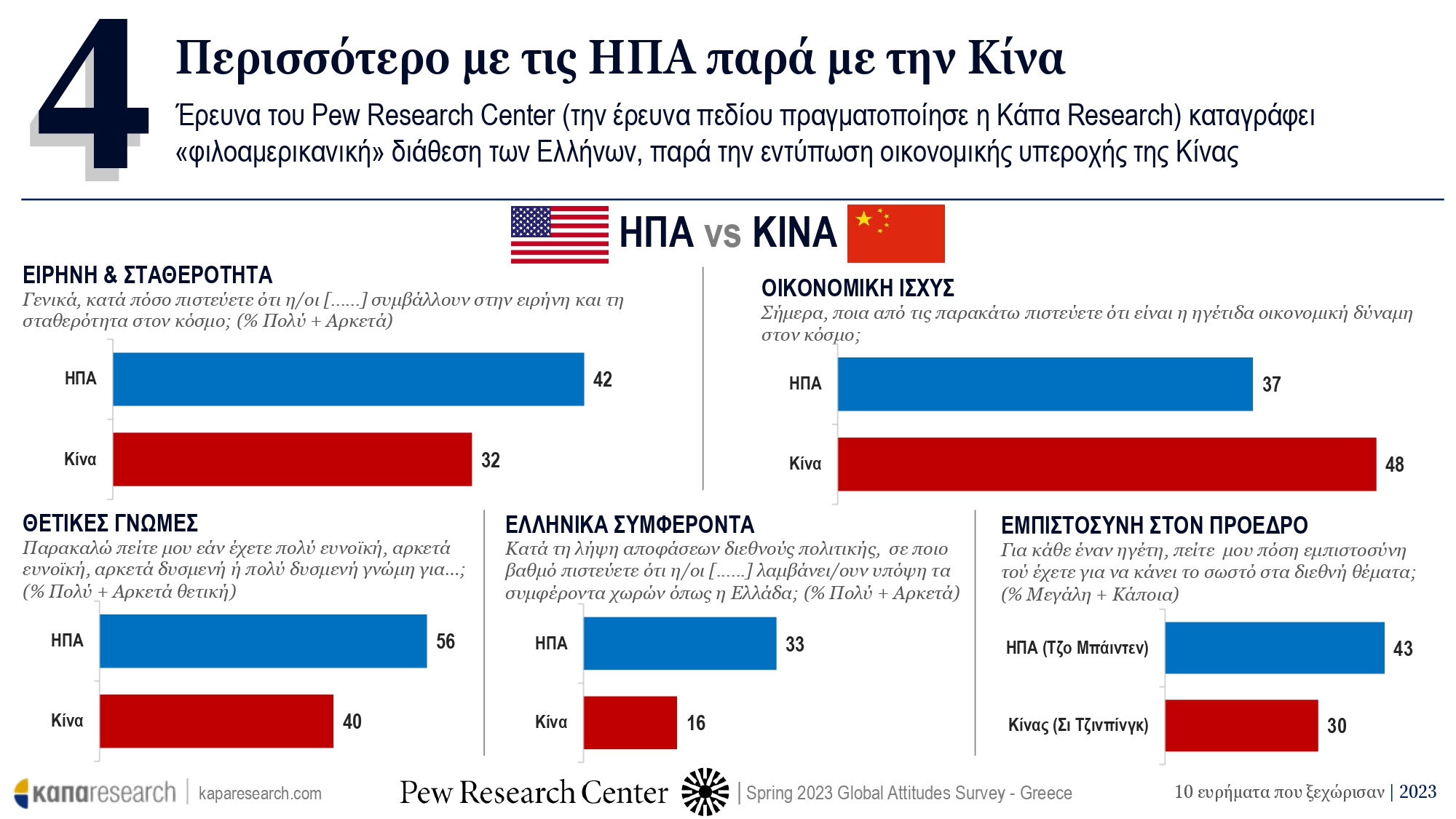 Έρευνα του Pew Research Center (την έρευνα πεδίου πραγματοποίησε η Κάπα Research) καταγράφει «φιλοαμερικανική» διάθεση των Ελλήνων, παρά την εντύπωση οικονομικής υπεροχής της Κίνας