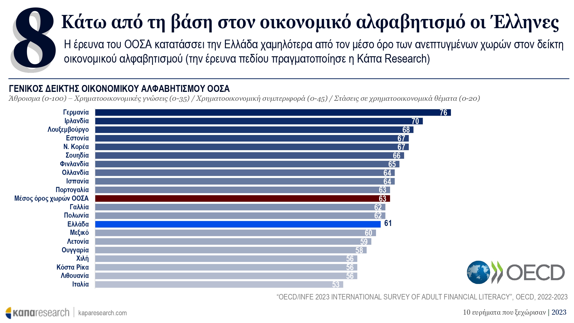 Η έρευνα του ΟΟΣΑ κατατάσσει την Ελλάδα χαμηλότερα από τον μέσο όρο των ανεπτυγμένων χωρών στον δείκτη οικονομικού αλφαβητισμού (την έρευνα πεδίου πραγματοποίησε η Κάπα Research)