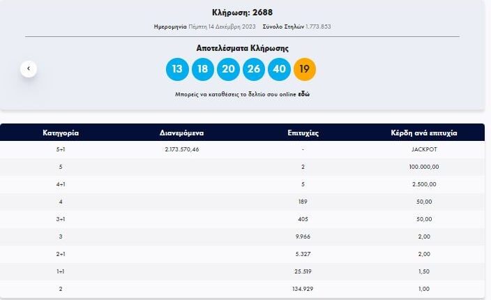 Στην κλήρωση ΤΖΟΚΕΡ, την Πέμπτη 14/12/2023 (αριθμός κλήρωσης 2688), οι τυχεροί αριθμοί ήταν οι εξής: