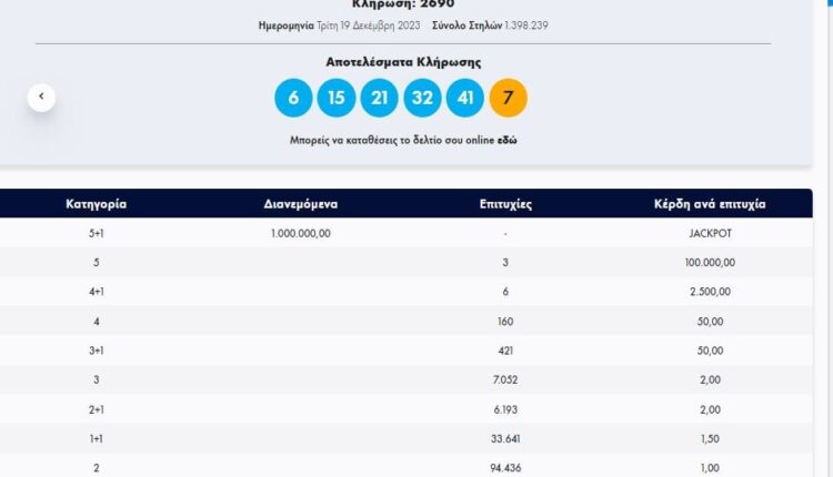 Στην κλήρωση ΤΖΟΚΕΡ, την Τρίτη 19/12/2023 (αριθμός κλήρωσης 2690), οι τυχεροί αριθμοί ήταν οι εξής:
