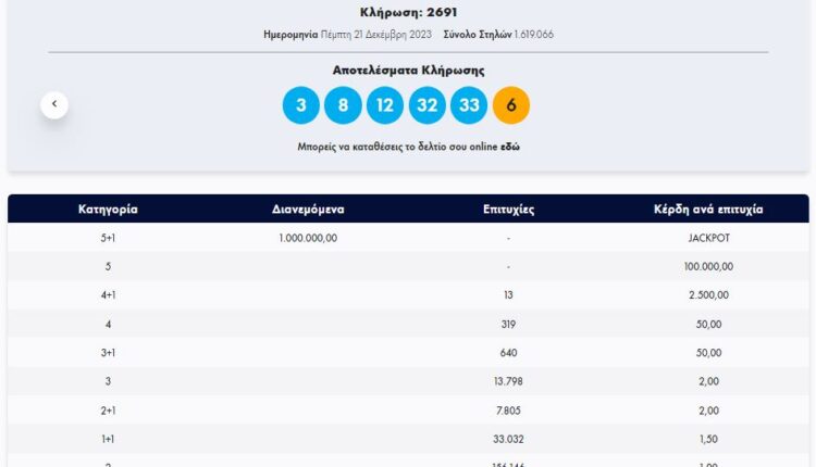Στην κλήρωση ΤΖΟΚΕΡ, την Πέμπτη 21/12/2023 (αριθμός κλήρωσης 2691), οι τυχεροί αριθμοί ήταν οι εξής: