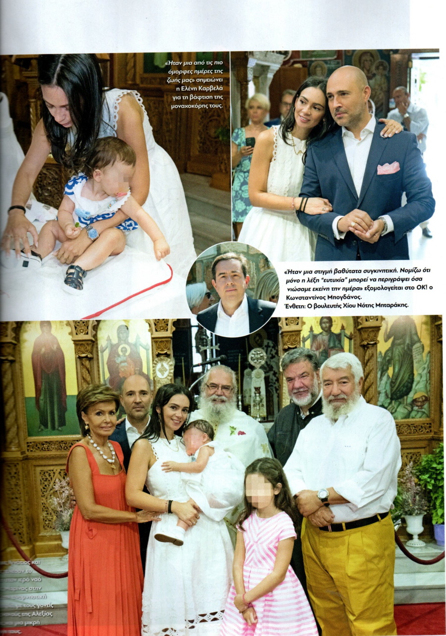 Όπως αποκαλύπτει η Έλενα Καρβελά στο περιοδικό, οι καλεσμένοι δεν ξεπερνούσαν τους 100, ενώ η βάφτιση έγινε σε στενό οικογενειακό κύκλο, καθώς σχεδόν πριν έναν μήνα έφυγε από τη ζωή ο πατέρας της.