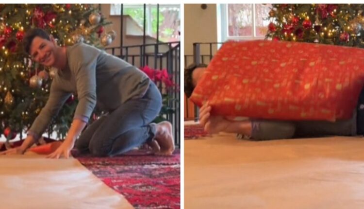 Ο κορυφαίος Έλληνας σταρ ανοίγοντας ένα μεγάλο χαρτί περιτυλίγματος δώρου, ξαπλώνει πάνω, όπου και αρχίζει να τυλίγεται ως… δώρο που θα πάρει η σύζυγός του, Κάτι Ζυγούλη για τις φετινές γιορτές των Χριστουγέννων.