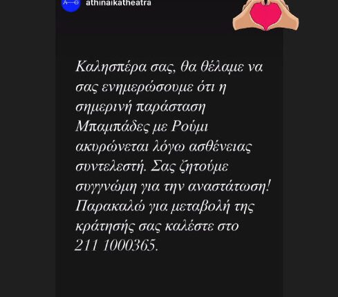 Αρχικά η επίσημη ενημέρωση ανέφερε: «Καλησπέρα σας, θα θέλαμε να σα ενημερώσουμε ότι η σημερινή παράσταση “Μπαμπάδες με Ρούμι” ακυρώνεται λόγω ασθένειας συντελεστή. Σας ζητούμε συγγνώμη για την αναστάτωση! Σας ευχαριστούμε για την κατανόηση», ανέφερε η ανάρτηση που έκαναν τα Αθηναϊκά Θέατρα.