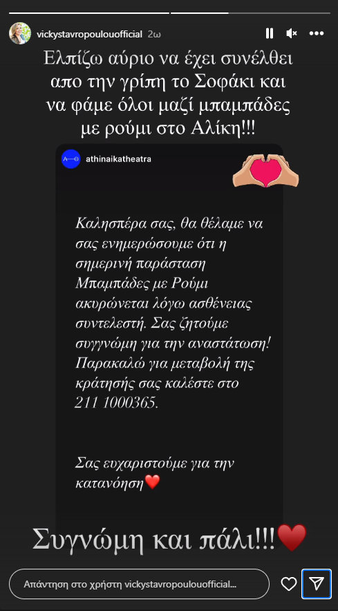 Την παραπάνω ανάρτηση έκανε repost η Βίκυ Σταυροπούλου αποκαλύπτοντας πως η Σοφία Βογιατζάκη μένει εκτός επαγγελματικών υποχρεώσεων εξαιτίας της γρίπης που την ταλαιπωρεί.