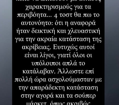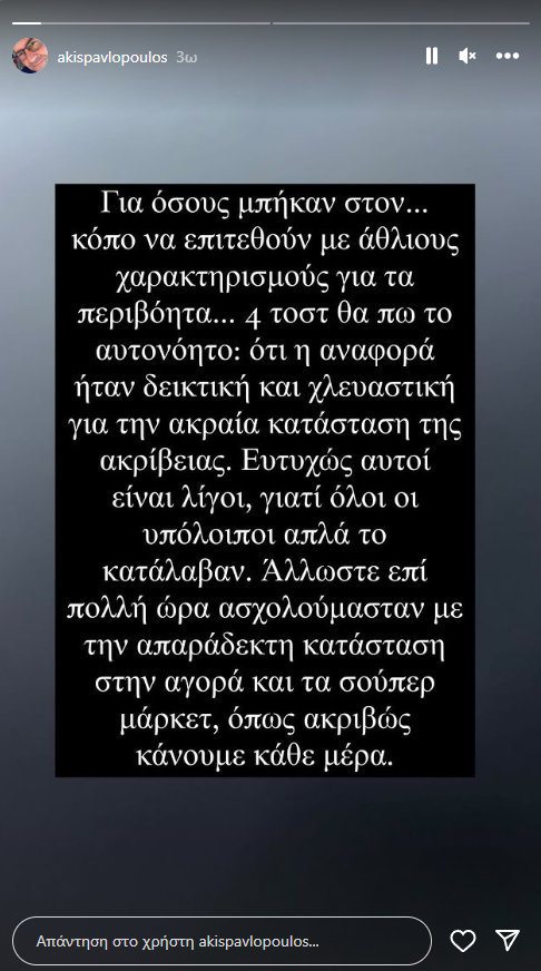 Λίγα 24ωρα μετά την ατάκα του δημοσιογράφου που προκάλεσε αντιδράσεις, ο Άκης Παυλόπουλος απάντησε μέσω instagram: «Για όσους μπήκαν στον…κόπο να επιτεθούν με άθλιους χαρακτηρισμούς για τα περιβόητα… τέσσερα τοστ θα πω το αυτονόητο: ότι η αναφορά ήταν δεικτική και χλευαστική για την ακραία κατάσταση της ακρίβειας. Ευτυχώς αυτοί είναι λίγοι, γιατί όλοι οι υπόλοιποι απλά το κατάλαβαν.