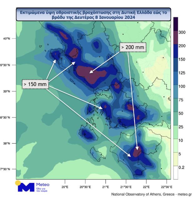 Στην παρακάτω ομάδα χαρτών του meteo.gr παρουσιάζεται το αθροιστικό ύψος βροχής που αναμένεται έως τις βραδινές ώρες της Δευτέρας 08/01 στη χώρα μας και στην Δυτική Ελλάδα.