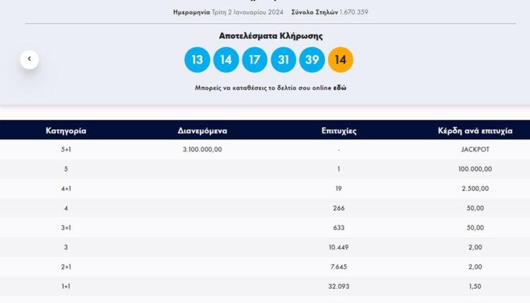 Στην κλήρωση ΤΖΟΚΕΡ, την Τρίτη 2/1/2024 (αριθμός κλήρωσης 2696), οι τυχεροί αριθμοί ήταν οι εξής: