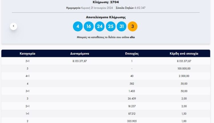 Στην κλήρωση ΤΖΟΚΕΡ, την Κυριακή 21/1/2024 (αριθμός κλήρωσης 2704), οι τυχεροί αριθμοί ήταν οι εξής: