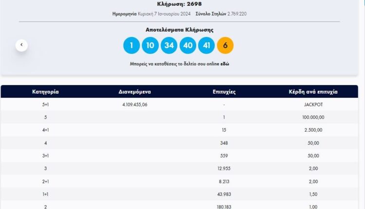 Στην κλήρωση ΤΖΟΚΕΡ, την Κυριακή 7/1/2024 (αριθμός κλήρωσης 2698), οι τυχεροί αριθμοί ήταν οι εξής: