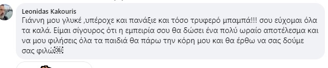 Πιο συγκεκριμένα, ο Λεωνίδας Κακούρης σχολίασε σε ανάρτηση του Γιάννη Νταλιάνη: «Γιάννη μου γλυκέ, υπέροχε και πανάξιε και τόσο τρυφερέ μπαμπά!!! σου εύχομαι όλα τα καλά. Είμαι σίγουρος ότι η εμπειρία σου θα δώσει ένα πολύ ωραίο αποτέλεσμα και να μου φιλήσεις όλα τα παιδιά, θα πάρω την κόρη μου και θα έρθω να σας δούμε σας φιλώ».