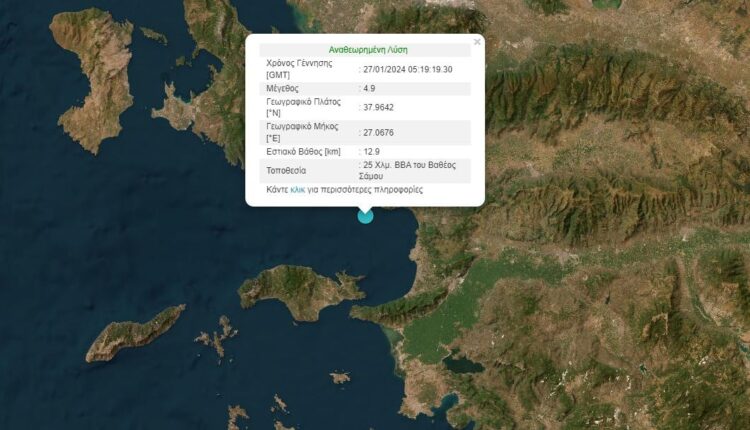 Σεισμός μεγέθους 4,9 βαθμών της κλίμακας Ρίχτερ σημειώθηκε το πρωί του Σαββάτου 27/1 ανοιχτά της Σάμου.