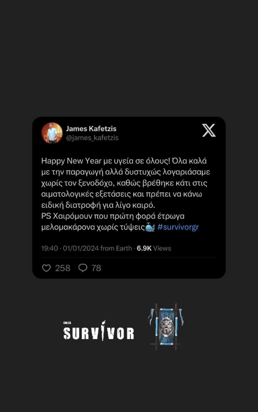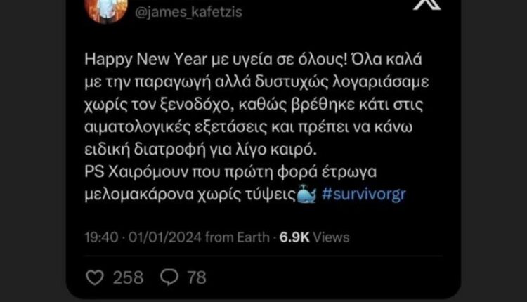 «Happy new year με υγεία σε όλους! Όλα καλά με την παραγωγή αλλά δυστυχώς λογαριάζαμε χωρίς τον ξενοδόχο, καθώς βρέθηκε κάτι στις αιματολογικές εξετάσεις και πρέπει να κάνω ειδική διατροφή για λίγο καιρό. Χαιρόμουν που πρώτη φορά έτρωγα μελομακάρονα χωρίς τύψεις», έγραψε ο Τζέιμς Καφετζής.