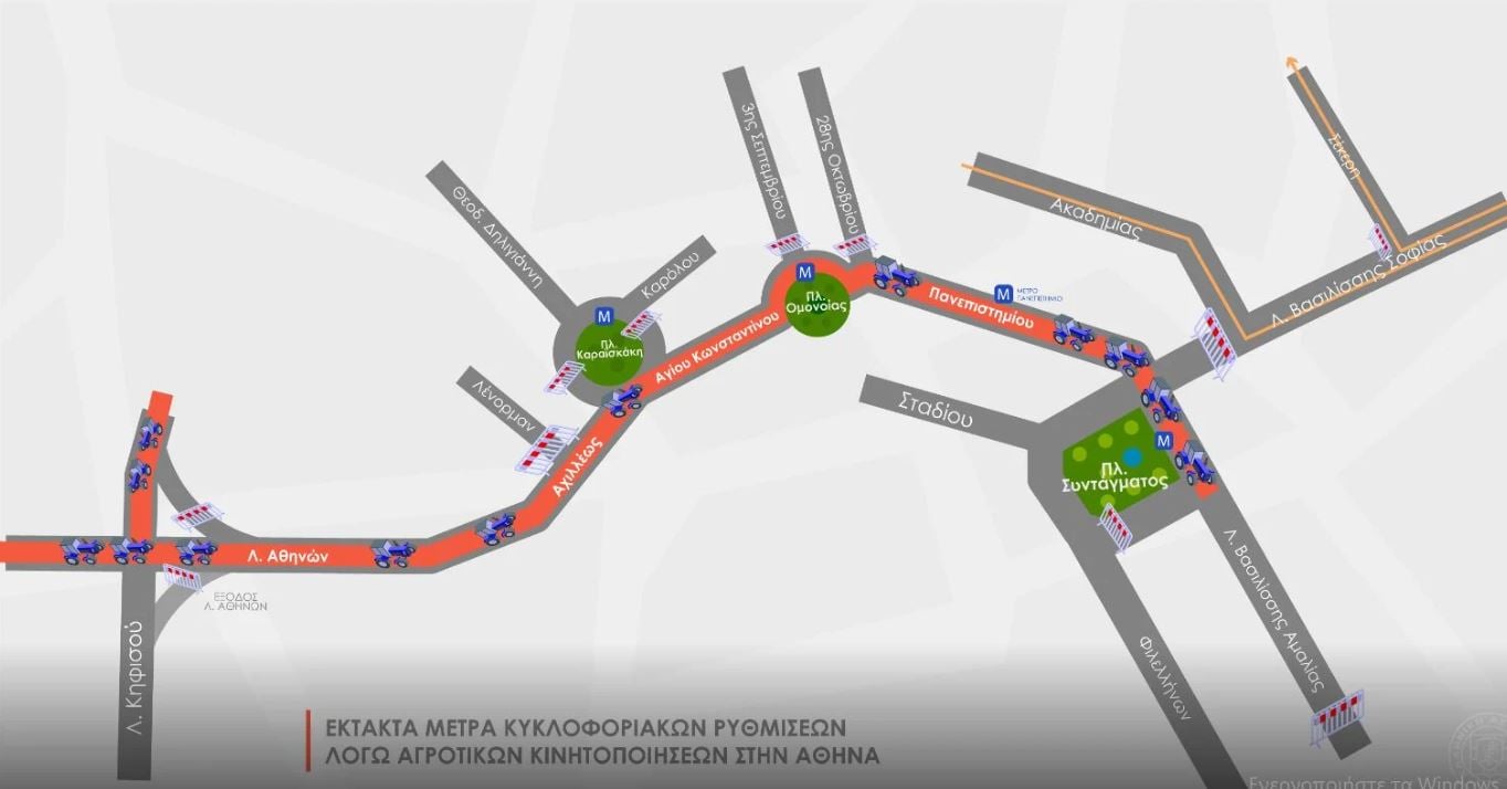 -Προσωρινή διακοπή της κυκλοφορίας κατά μήκος του δρομολογίου που θα ακολουθήσουν τα αγροτικά οχήματα: Λεωφόρος Αθηνών, Αχιλλέως, πλατεία Καραϊσκάκη. Θα κινηθούν αντίθετα στην οδό Αγίου Κωνσταντίνου, την πλατεία Ομονοίας και την οδό Πανεπιστημίου, προκειμένου να φθάσουν στο Σύνταγμα. Θα υπάρξει προσωρινή διακοπή της κυκλοφορίας πέριξ της πλατείας Ομονοίας.