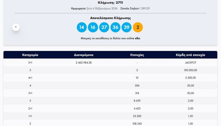 Στην κλήρωση ΤΖΟΚΕΡ, την Τρίτη 6/2/2024 (αριθμός κλήρωσης 2711), οι τυχεροί αριθμοί ήταν οι εξής: