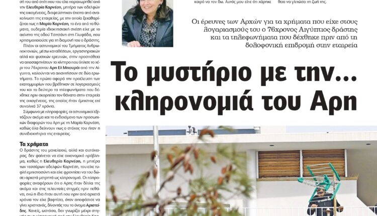 Σύμφωνα με πληροφορίες, οι αστυνομικοί εξετάζουν ακόμα και το ενδεχόμενο των προσωπικών διαφορών του Αρη με τη Μαρία Καρνέση, καθώς όλα δείχνουν πως ο στόχος του ήταν η συνιδιοκτήτρια της εταιρείας.